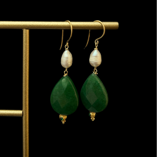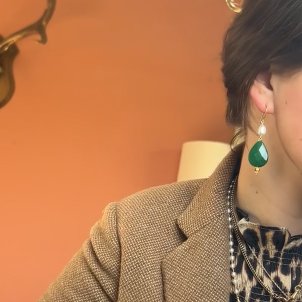 Deze oorbellen zijn gemaakt van een laagje goud op sterling zilver, groene jade en een grote zoetwaterparel. Aan de onderkant hangt een bol ( laagje goud op zilver) die is afgewerkt met kleine steentjes.
