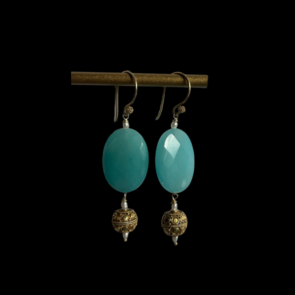 Oorbellen van een laagje goud op sterling zilver, facet geslepen turquoise jade, kleine pareltjes en grote gouden bollen (een laagje goud op sterling zilver)