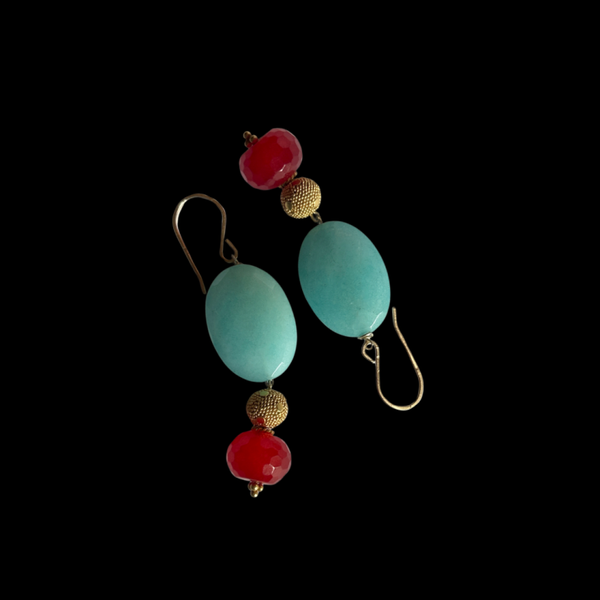 Oorbellen van facet geslepen jade, robijn kwarts en een gouden bol