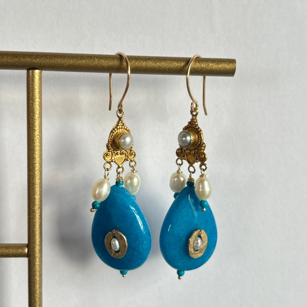 Oorbellen van een laagje goud op sterling zilver. Parels met facet geslepen turquoise jade die zijn ingelegd met pareltjes.