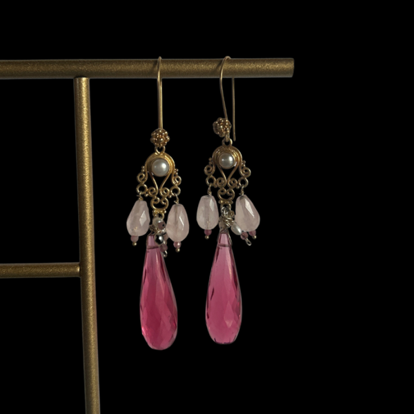Deze oorbellen zijn vervaardigd uit een laagje mat goud op sterling zilver. Onder de oorhaak bevindt zich een hanger met een parel erin verwerkt. Daaronder hangt een grote rozenkwarts, gecombineerd met toermalijn in verschillende kleuren.