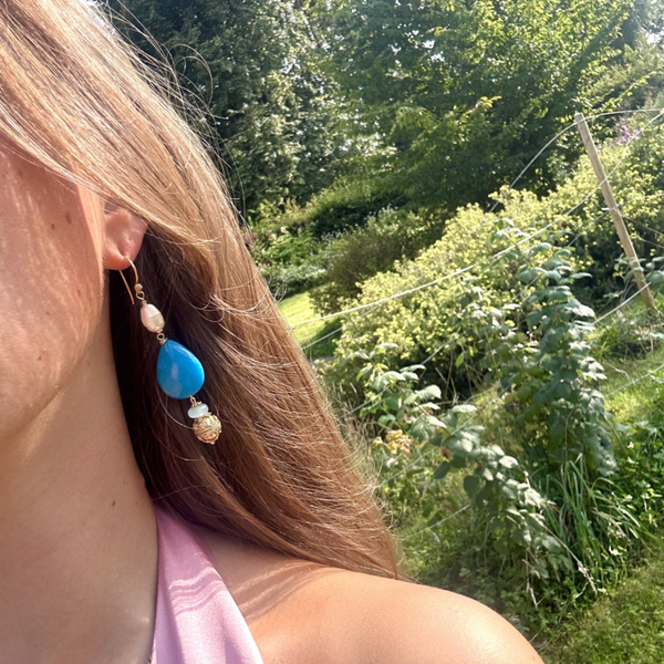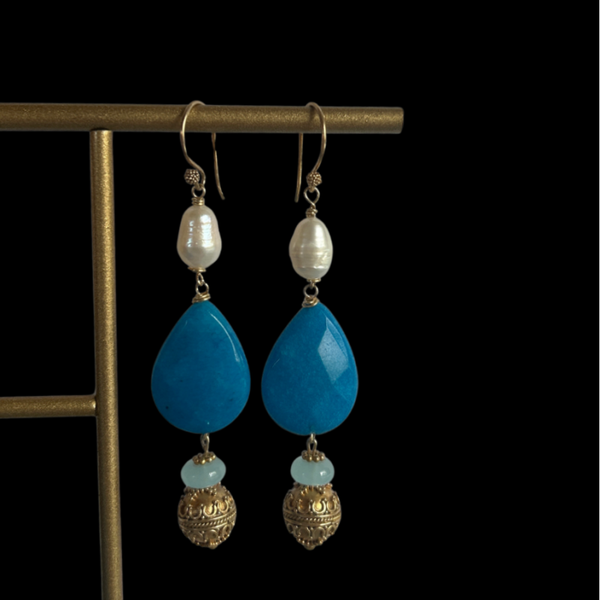 Deze oorbellen zijn van een laagje goud op sterling zilver. Aan de oorbel hangt een grote parel, sky blue chalcedoon, facet geslepen jade en een gouden bol (laagje goud op sterling zilver).