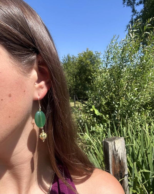 Deze oorbellen zijn gemaakt van een laagje goud op sterling zilver en afgewerkt met peridot, groene agaat en een gouden bol (goud op sterling zilver) waarin edelstenen zijn verwerkt.