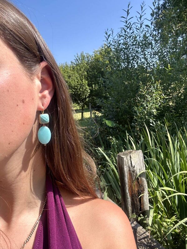 Oorbellen gemaakt van een laagje goud op sterling zilver, facet geslepen turkoois en jade.