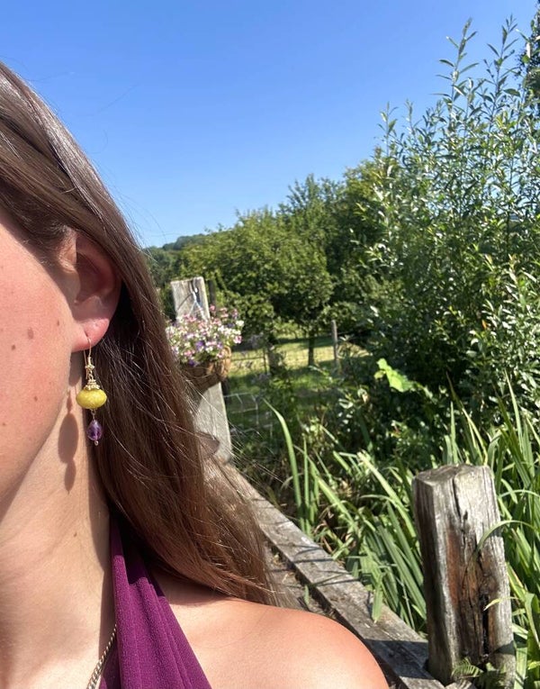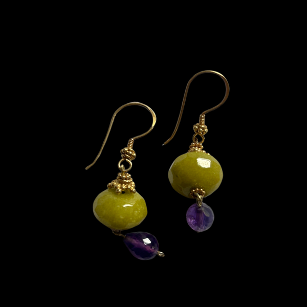 Deze oorbellen zijn vervaardigd van een laagje goud op sterling zilver en zijn afgewerkt met facetgeslepen groene jade en amethist.