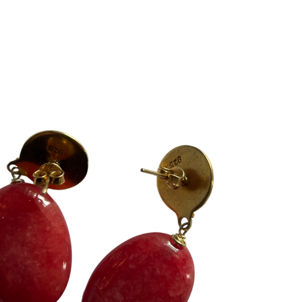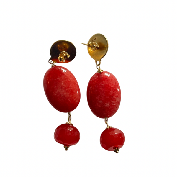 Oorstekers met agaat, gemaakt van een laagje goud op sterling zilver. Verder gladde ovale jasper kwarts. Onderaan hangt een facet geslepen robijn kwarts.