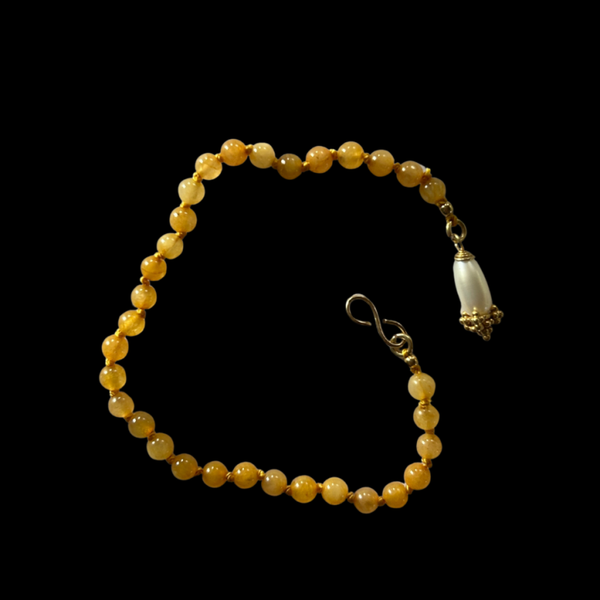 Deze jade armband is met de hand geknoopt op zijden draad. Het slotje is van een laagje goud op sterling zilver en heeft een parel die als bedel hangt.
