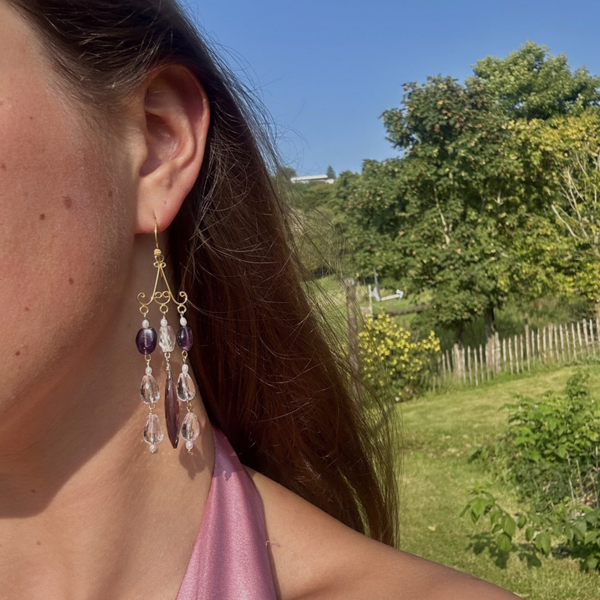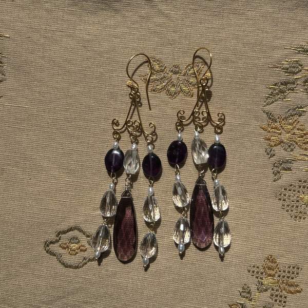 Deze oorbellen zijn gemaakt van een laagje goud op sterling zilver. Amethist, kwarts en een zoetwaterparel.