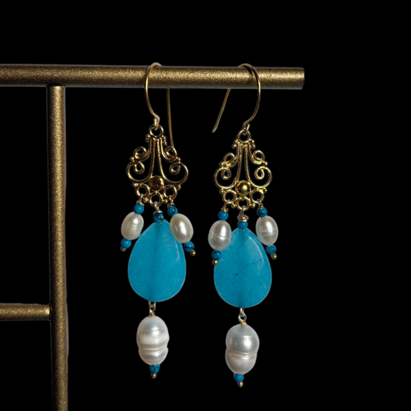 Deze oorbellen zijn gemaakt van een laagje goud op sterling zilver en zijn afgewerkt met facetgeslepen jade, turkoois en zoetwaterparels.