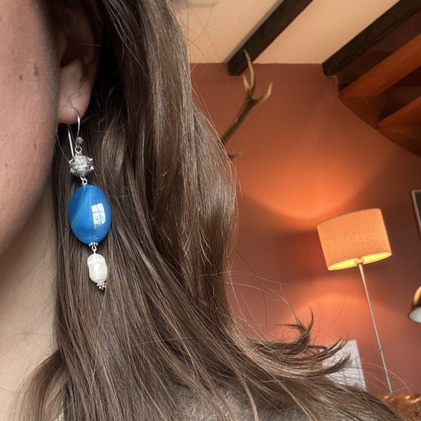 Sterling zilveren oorbellen met gladde agaat, zoetwaterparel en een grote sterling zilveren bol.