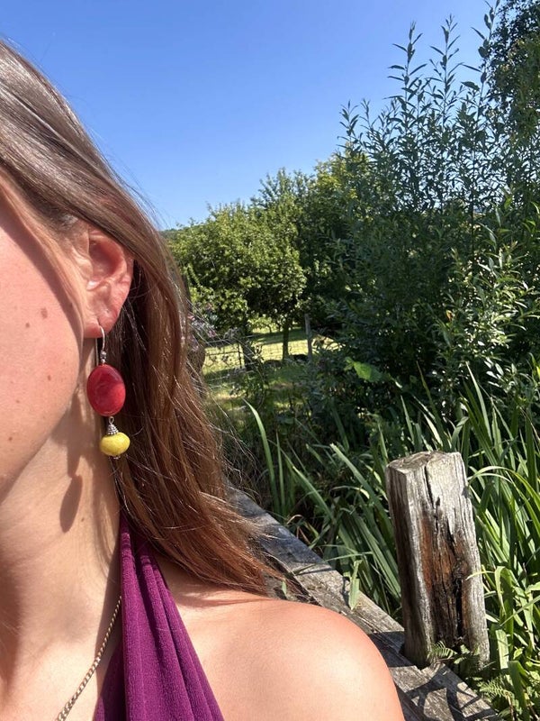 De lengte is 6,4 cm, breedte 1,8 cm en de oorbellen wegen samen 17,4 gram.