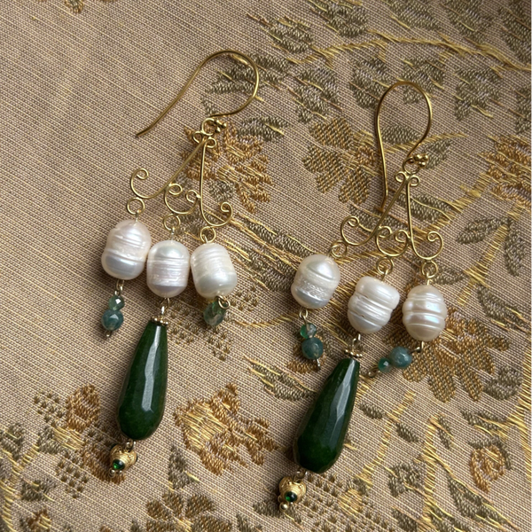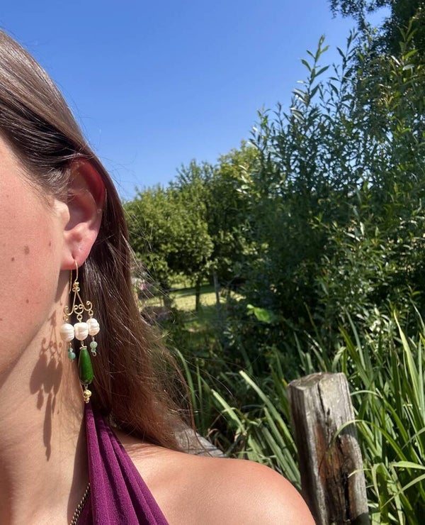 Oorbellen met een laagje goud op sterling zilver. Facetgeslepen mosagaat, jade, onyx, gouden bal (sterling zilver met dun laagje goud) met edelsteentjes er in verwerkt en zoetwaterparels.